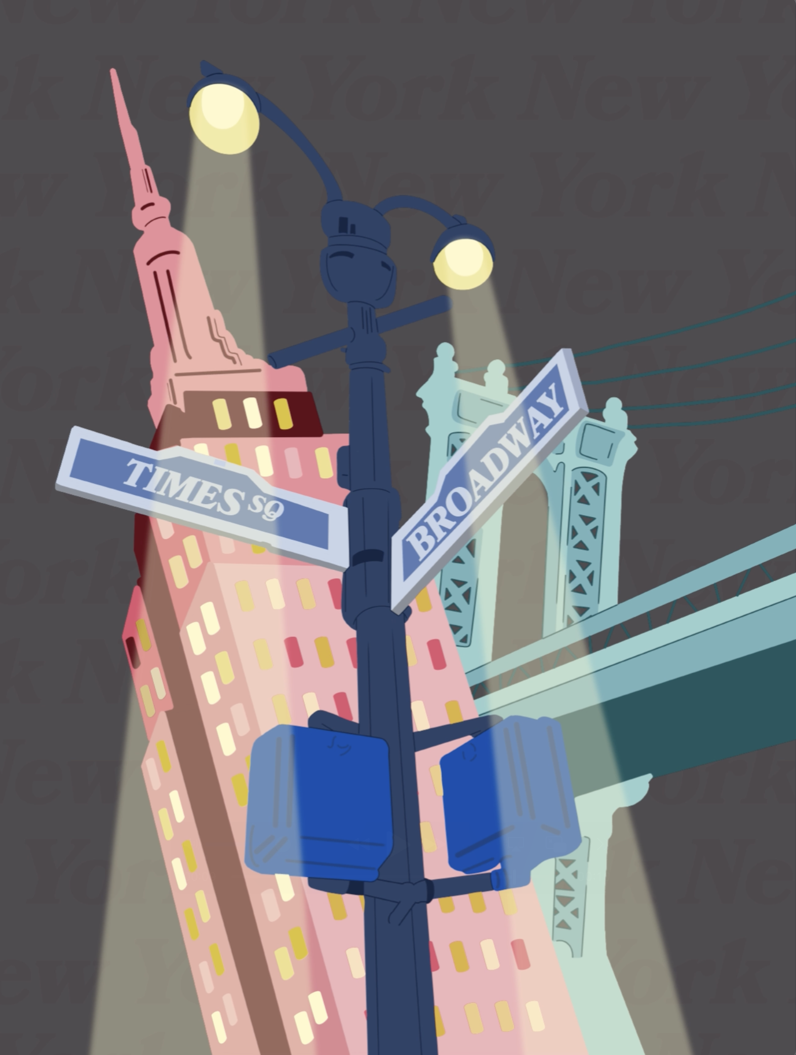 I always start with a sketch. I gathered reference images and collaged them in a way that creates depth. I then found the color palate that spoke to the brightness of the city in my view. Once the initial graphic was complete, I transffered it into Adobe After Effects to begin animation.